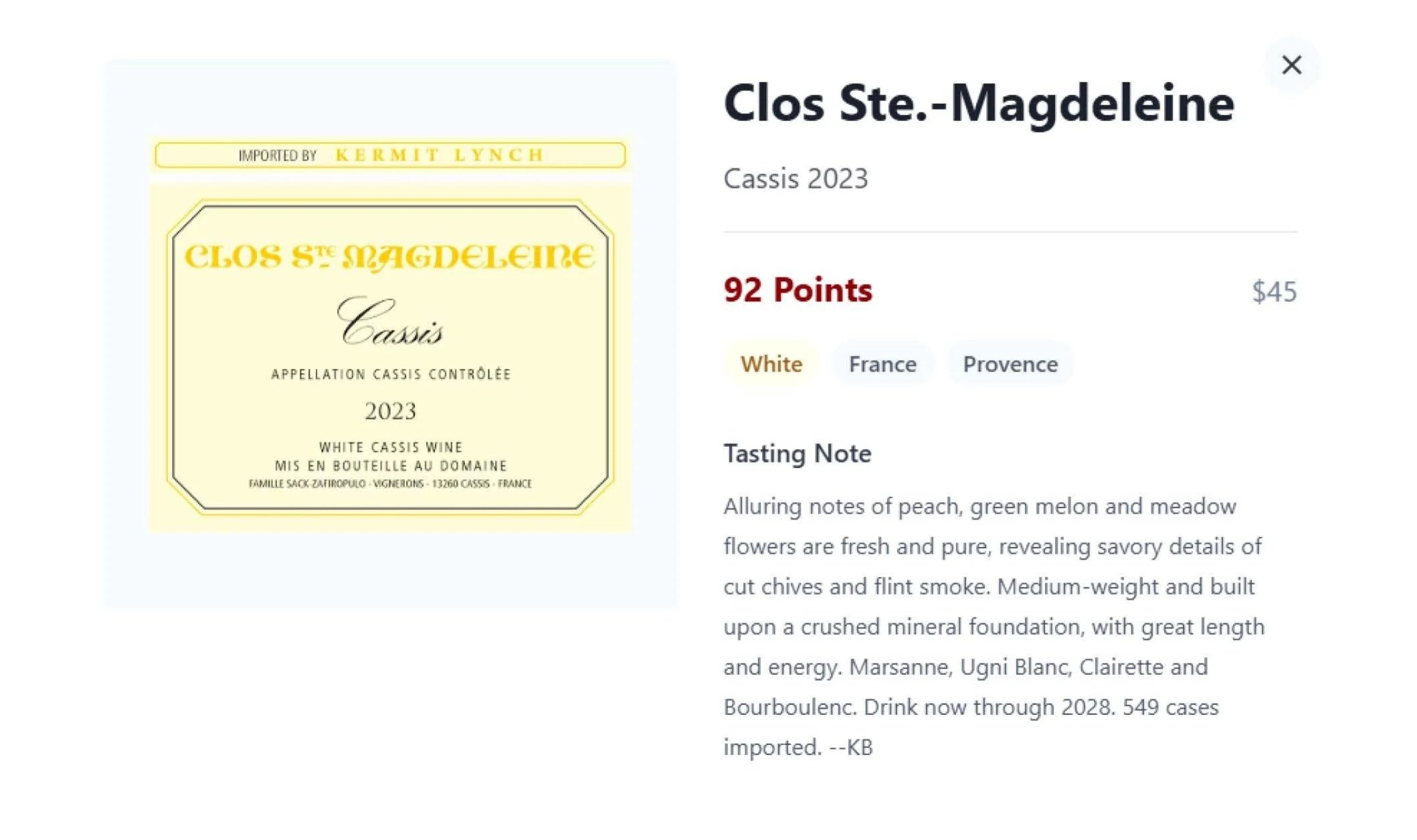 La note citronnée du nez marque l’éclat et la tension. La salinité est typique du Clos. La bouche offre un touché ciselé et vibrant. K.VALENTIN